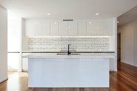 • Modern kitchen with plenty of storage cabinets and rangehood