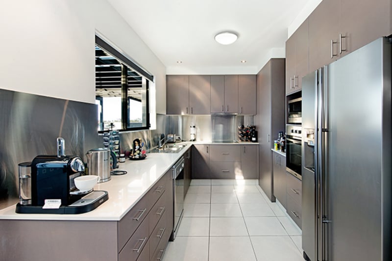 * Modern kitchen with Stone bench tops, stainless steel dishwasher, range