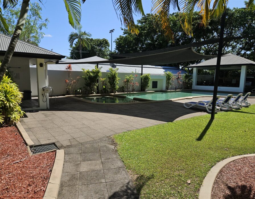Large entertainment area with pool in complex