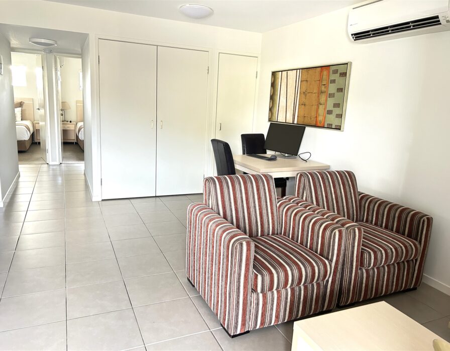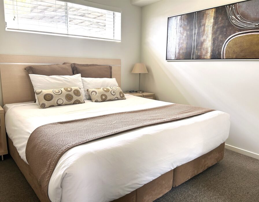 Each of the 2 bedrooms has air-conditioning, a fan and built in cupboard, along with access to its own bathroom. White timber blinds and a neutral colour scheme enhance the modern touch.