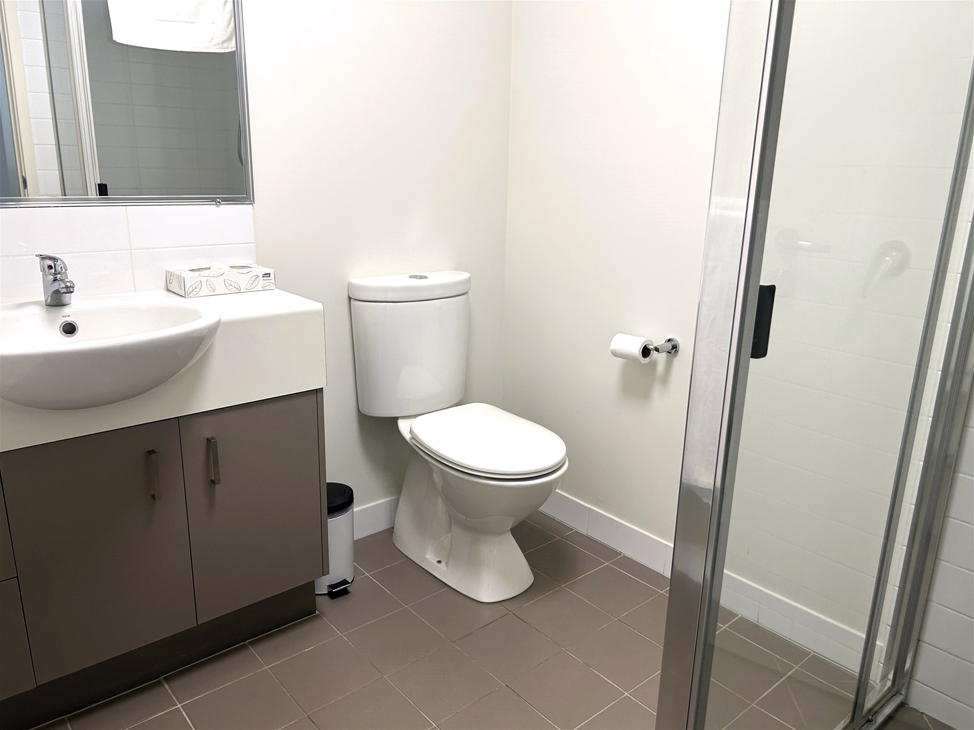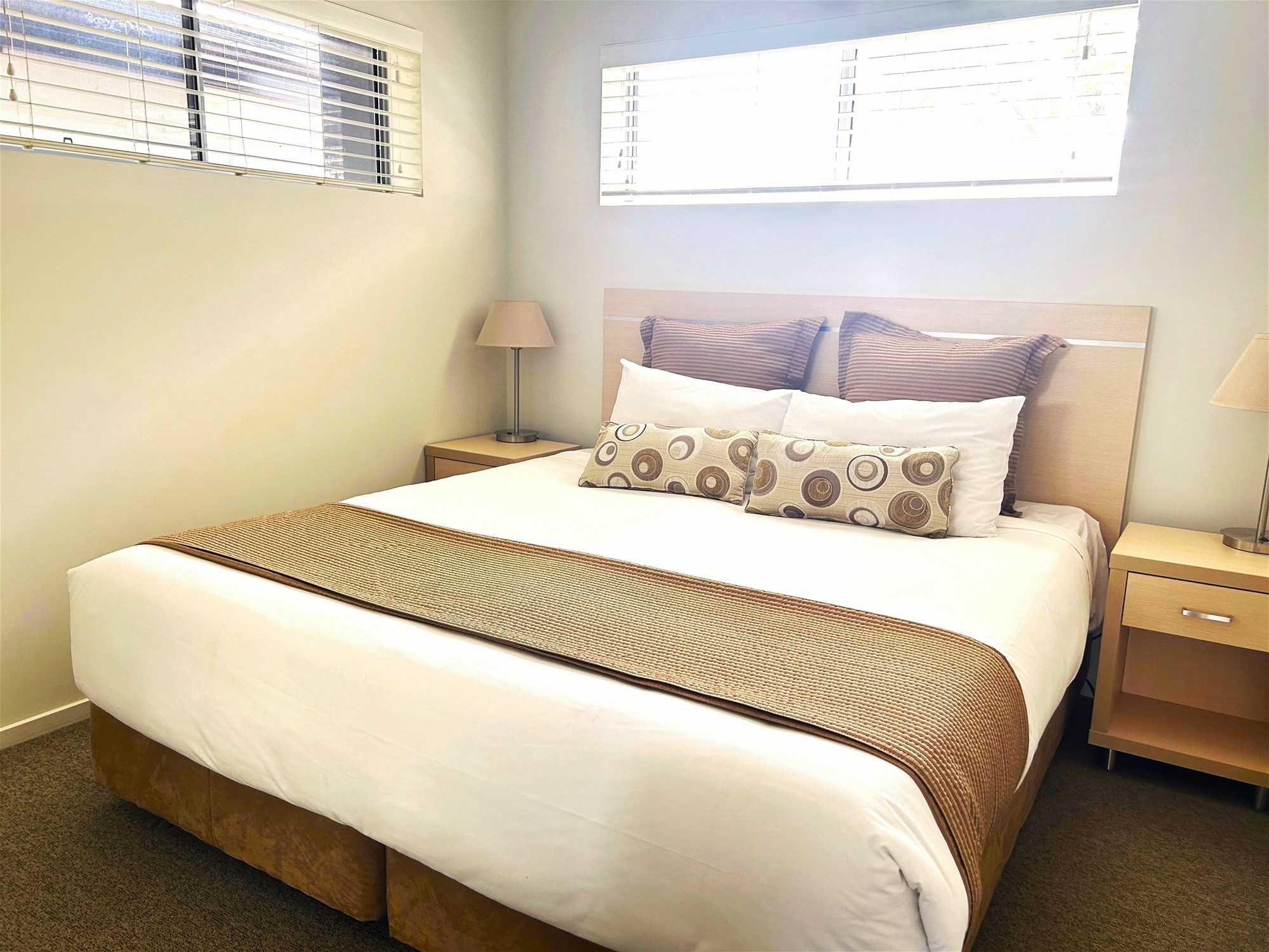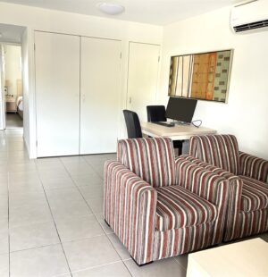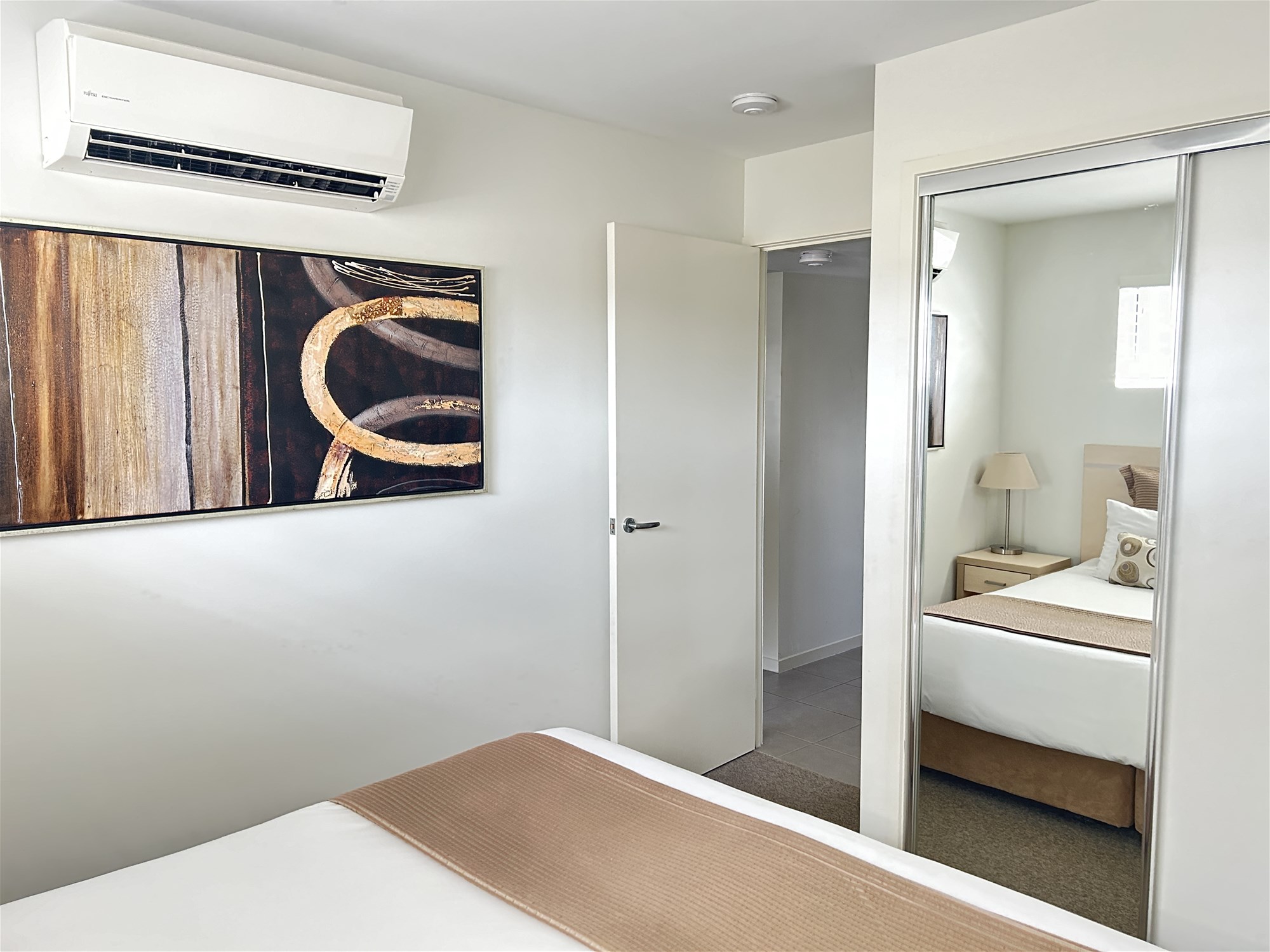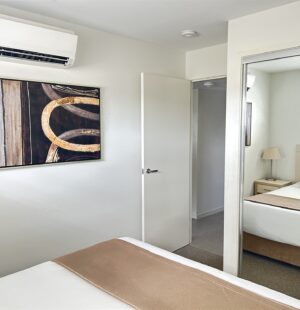 Each of the 2 bedrooms has air-conditioning, a fan and built in cupboard, along with access to its own bathroom. White timber blinds and a neutral colour scheme enhance the modern touch.
