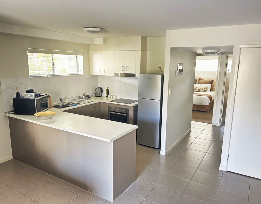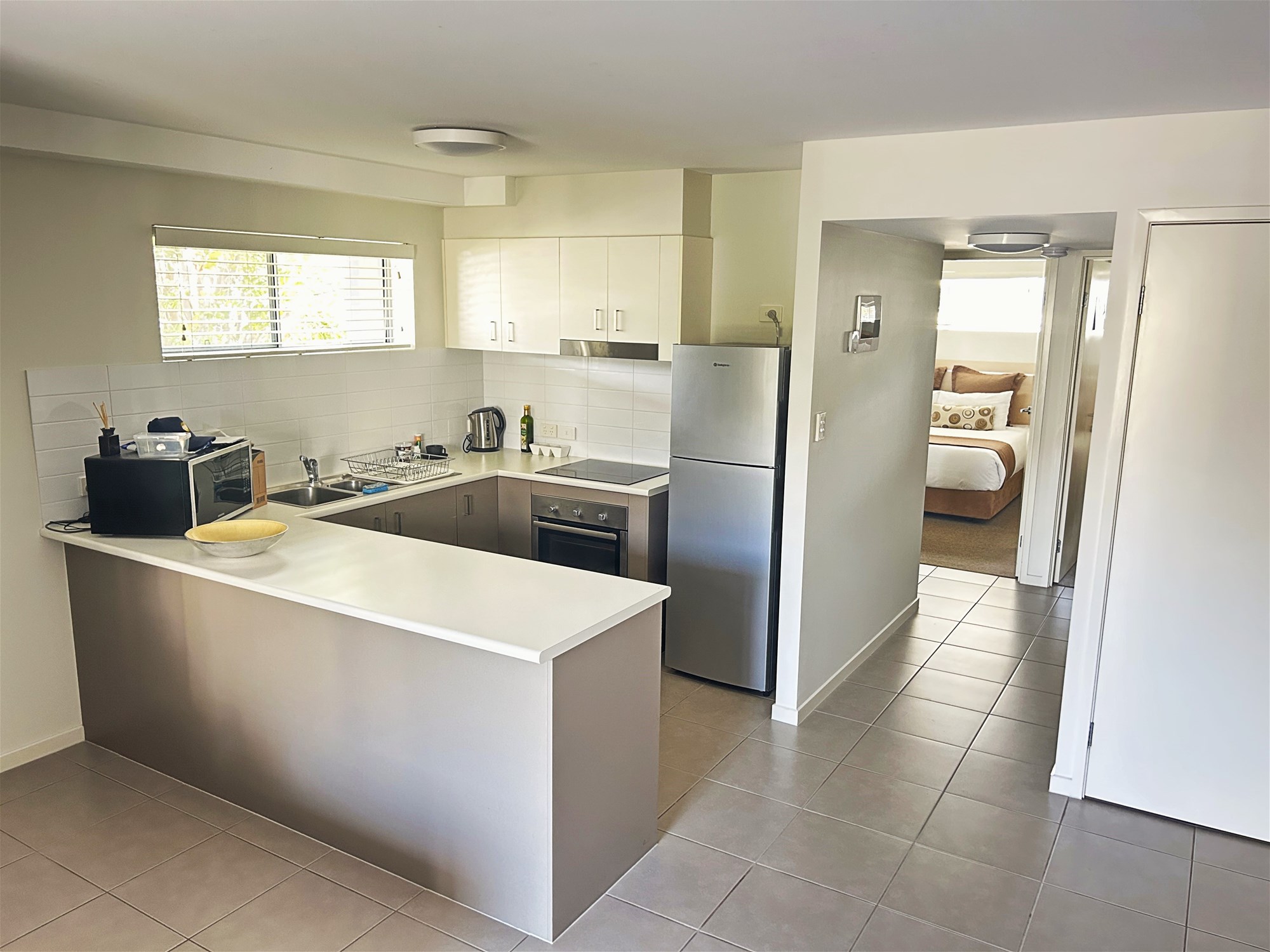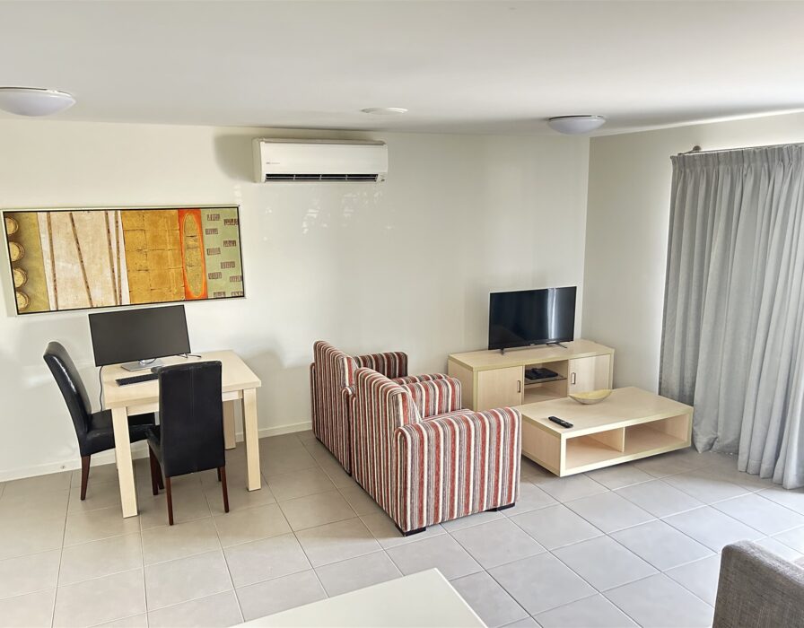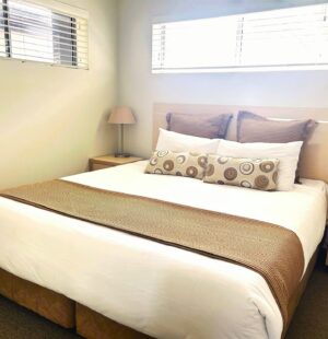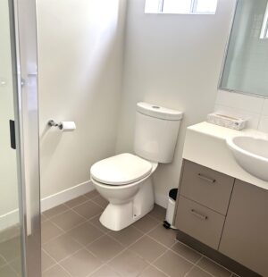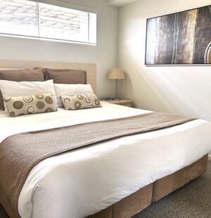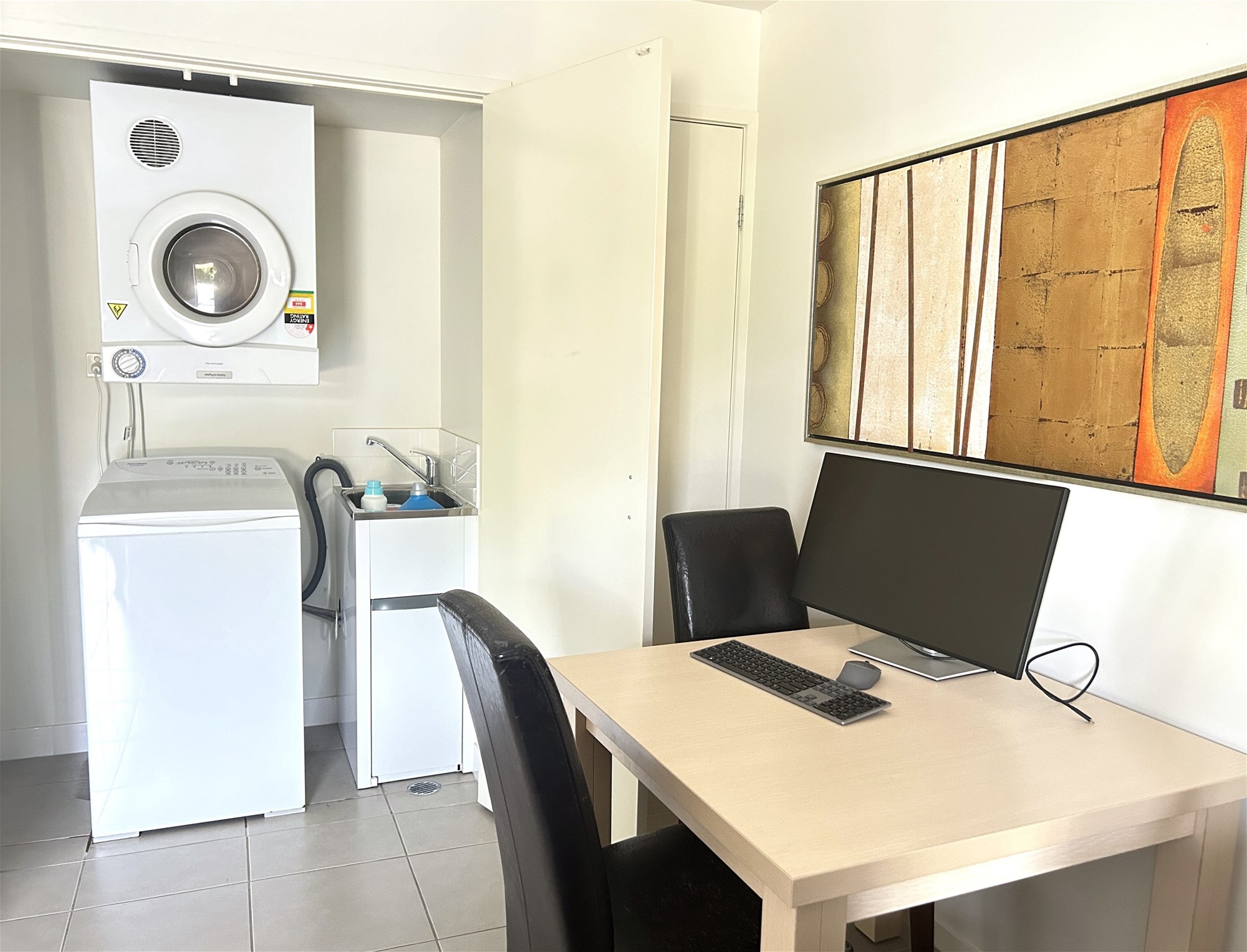 Each of the 2 bedrooms has air-conditioning, a fan and built in cupboard, along with access to its own bathroom. White timber blinds and a neutral colour scheme enhance the modern touch.