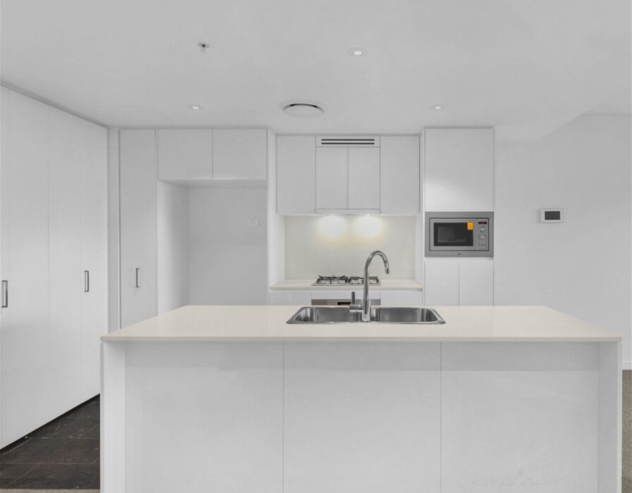 Sleek modern kitchen with gas cooktop, stone benchtops, built-in microwave, dishwasher, and breakfast bar