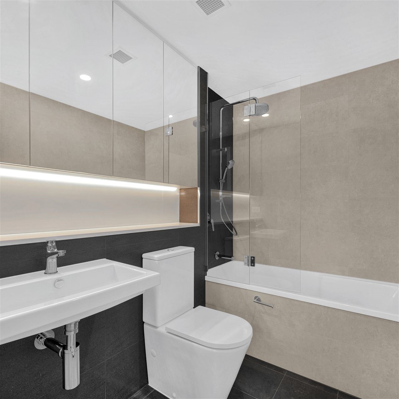 Two elegant bathrooms with designer tiles and LED mirrors