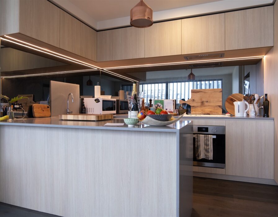 – Modern kitchen with waterfall design stone high end bench-top