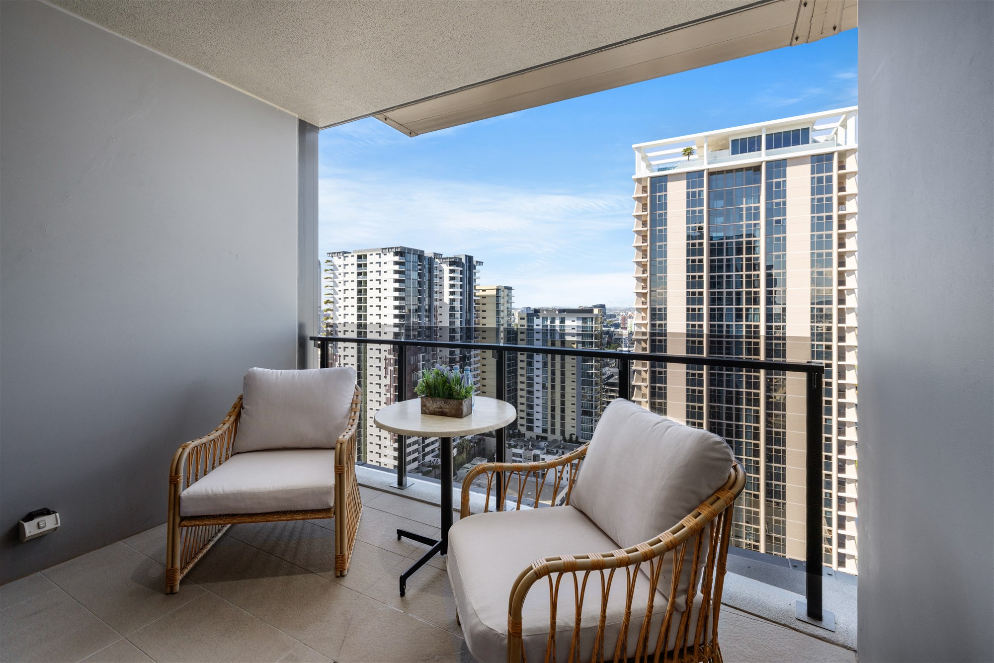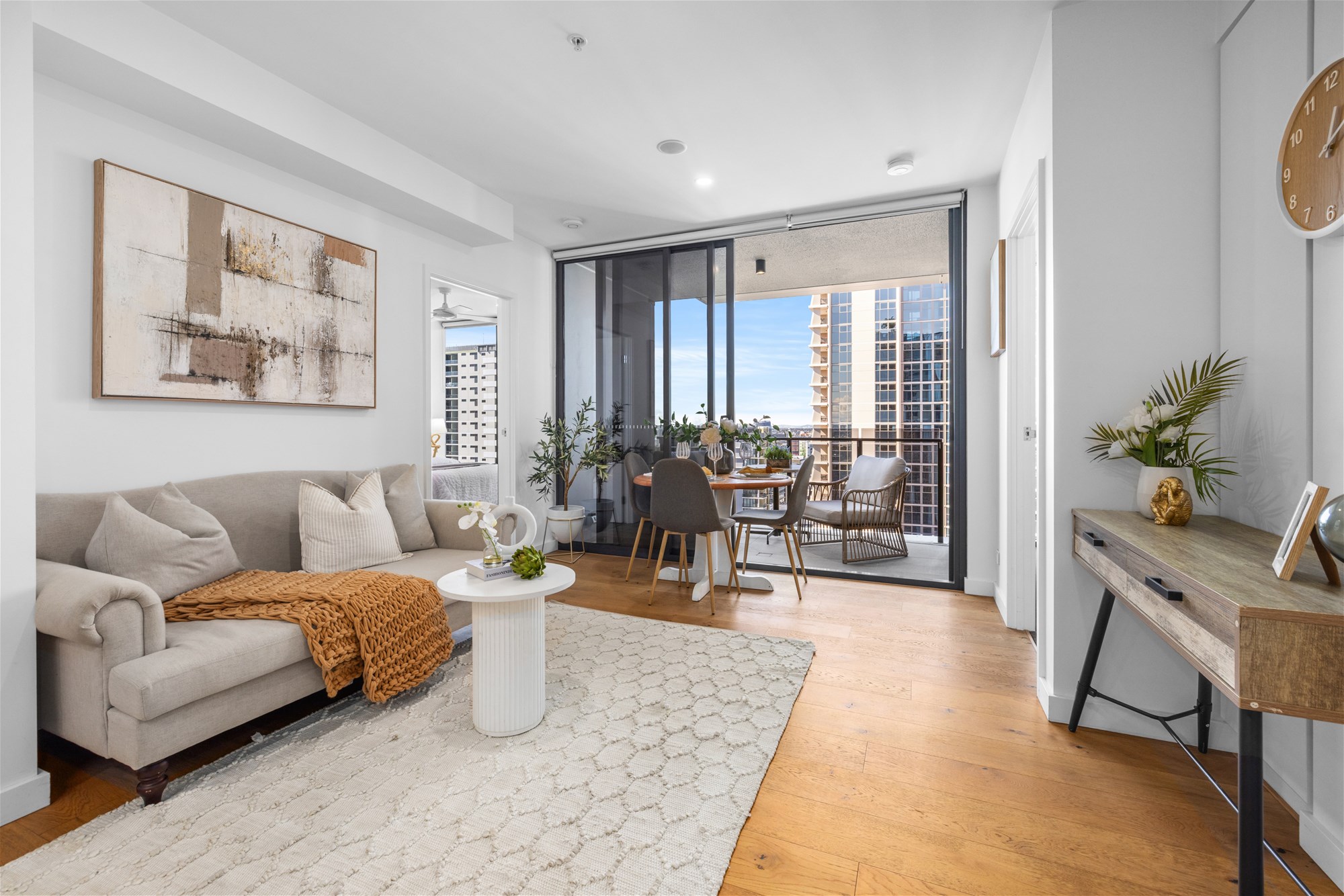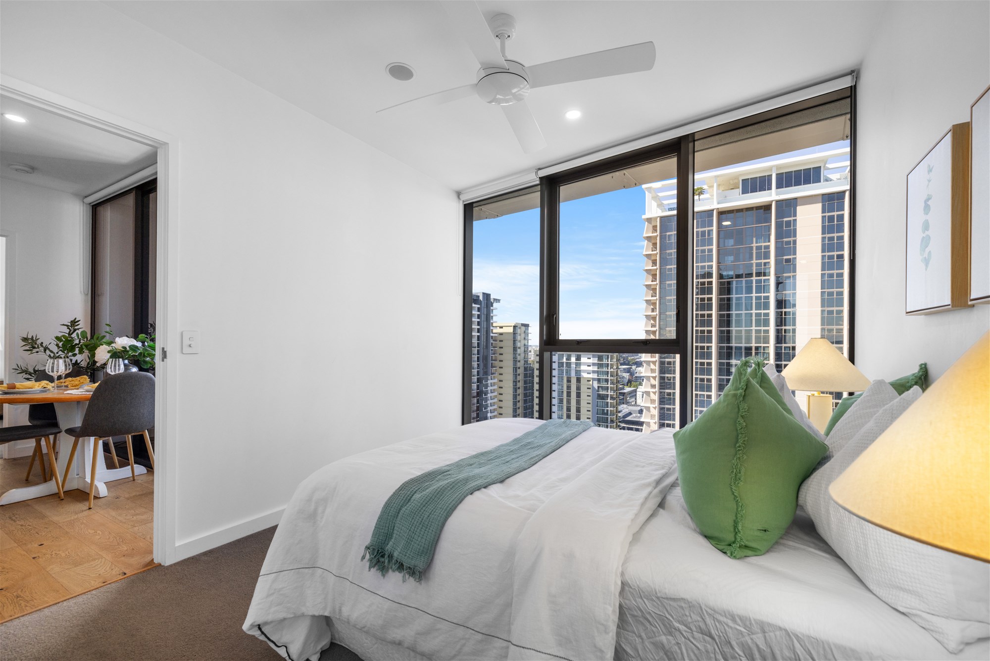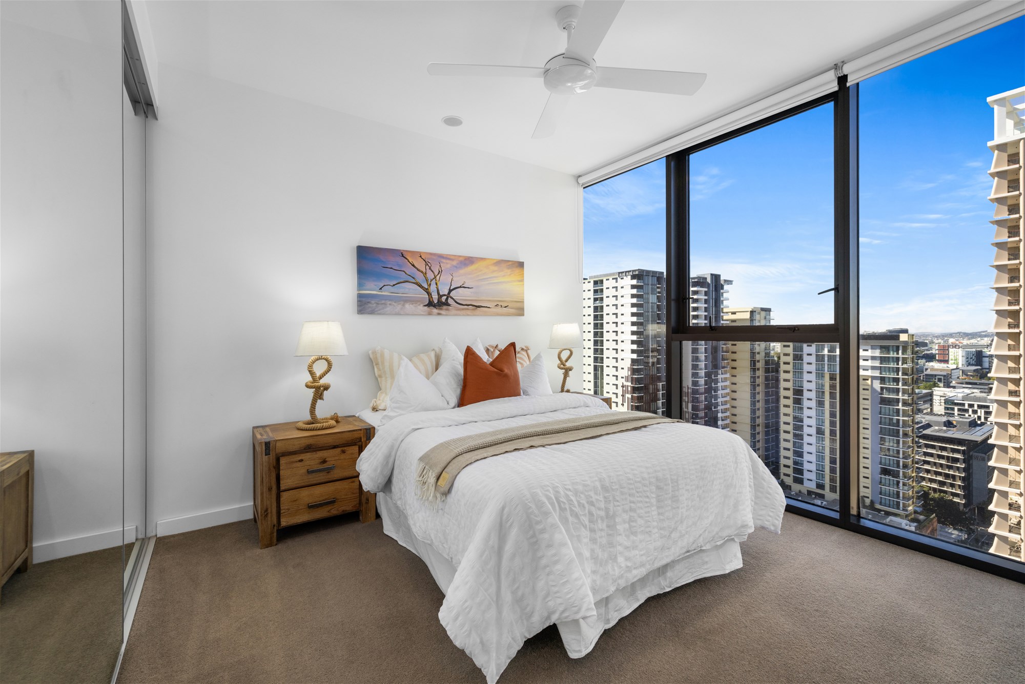 Floor-to-ceiling glass draws you to the generously sized balcony, where youll enjoy panoramic vistas of the Brisbane River, South Bank and the city skyline. Both bedrooms are well-proportioned with plush carpet and built-in robes, while the sleek bathroom is styled with premium finishes and excellent storage.
