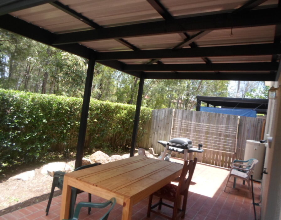 Large covered entertainment area with pool, BBQ and park lands surrounding complex