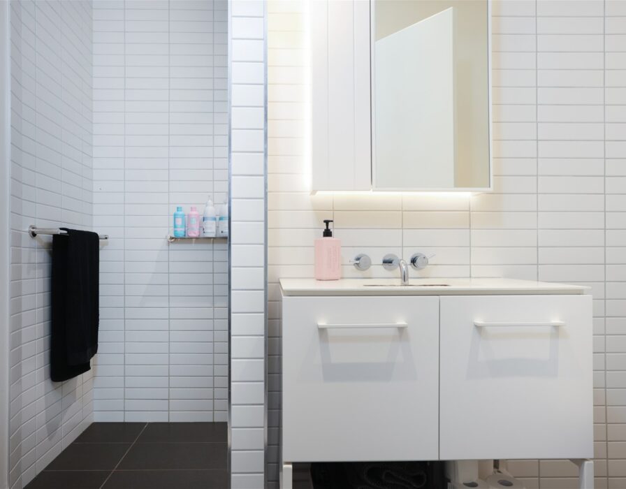 Modern bathroom with oversized shower and generous storage