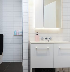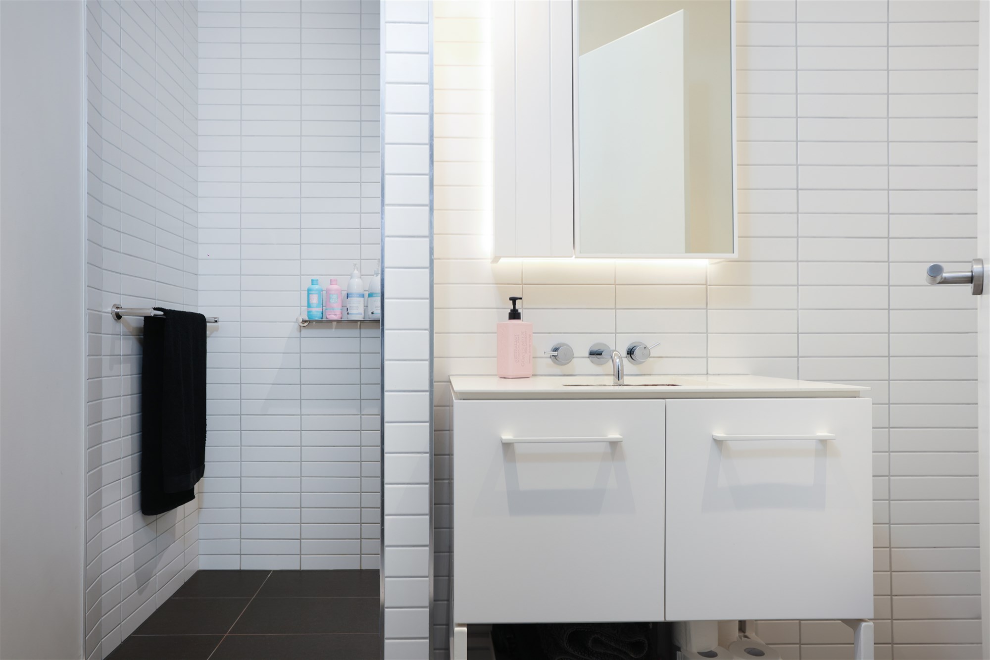 Modern bathroom with oversized shower and generous storage