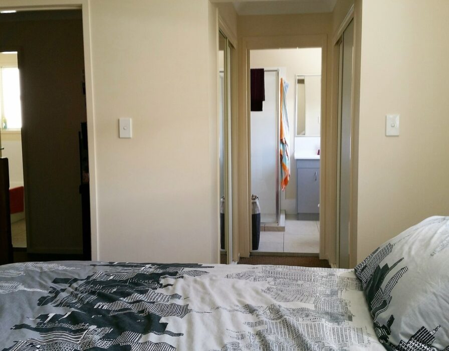 * Master bedroom with ensuite mirrored built-ins.