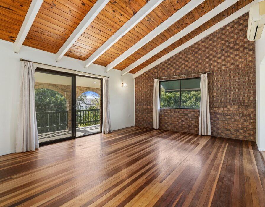 Adorned with polished timber flooring and soaring, raked ceilings, the upper level of this delightful home features a bright and breezy air conditioned living room that opens onto the north-east facing balcony; capturing cooling breezes and a place to relax here with the family or entertain friends.