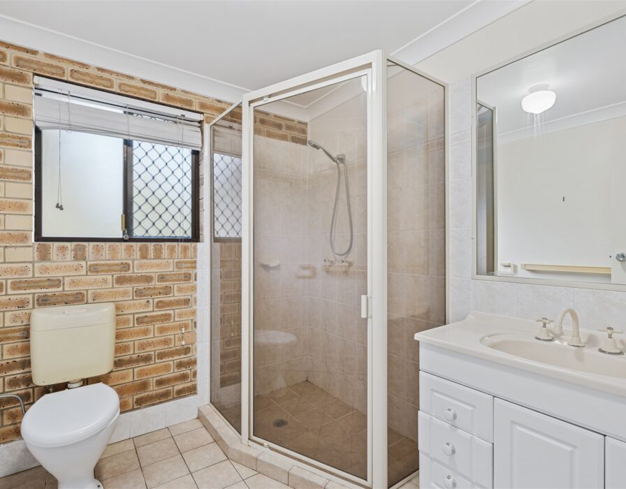 – Main bathroom with dual basin vanity, shower, bath and separate toilet