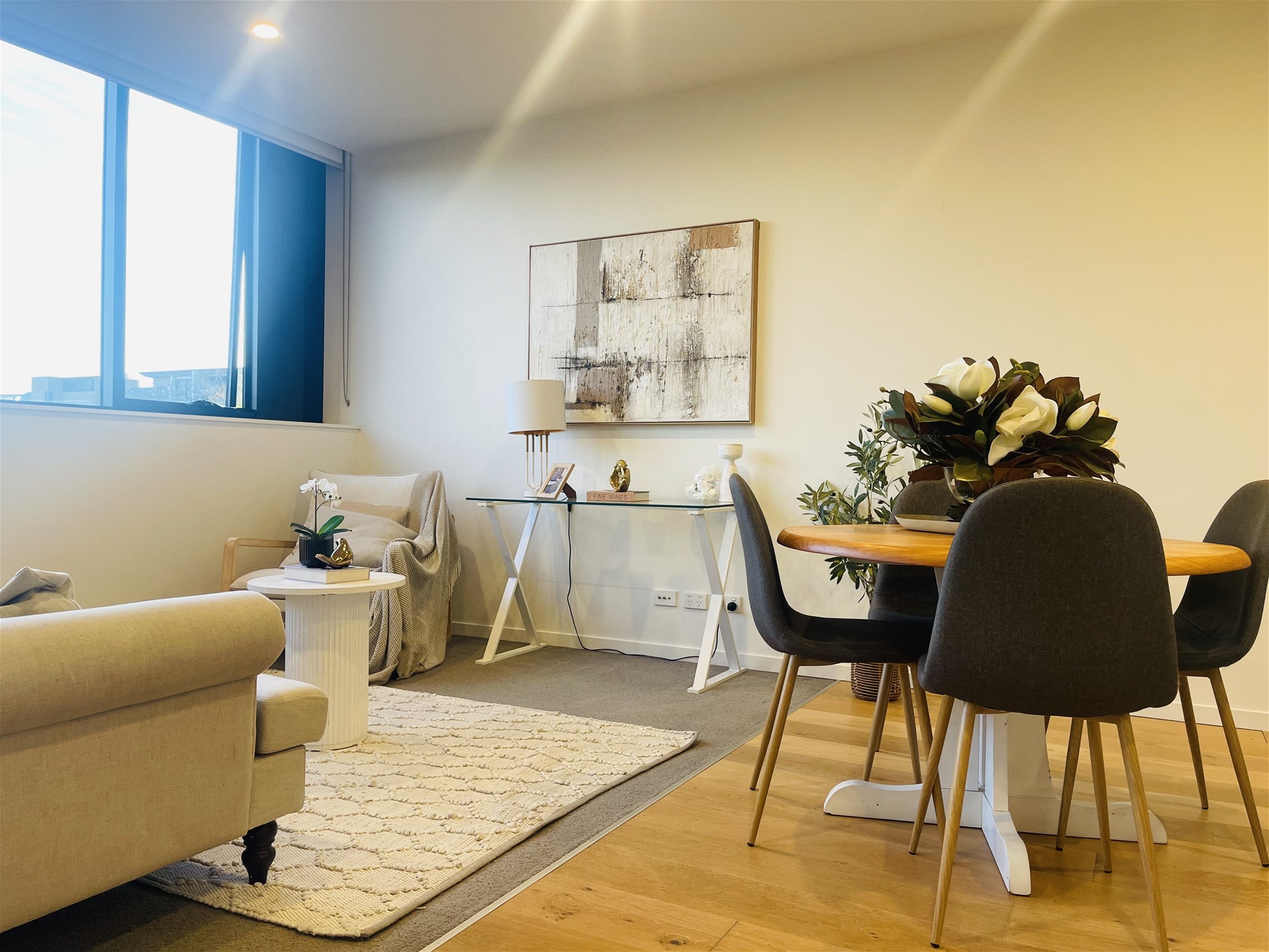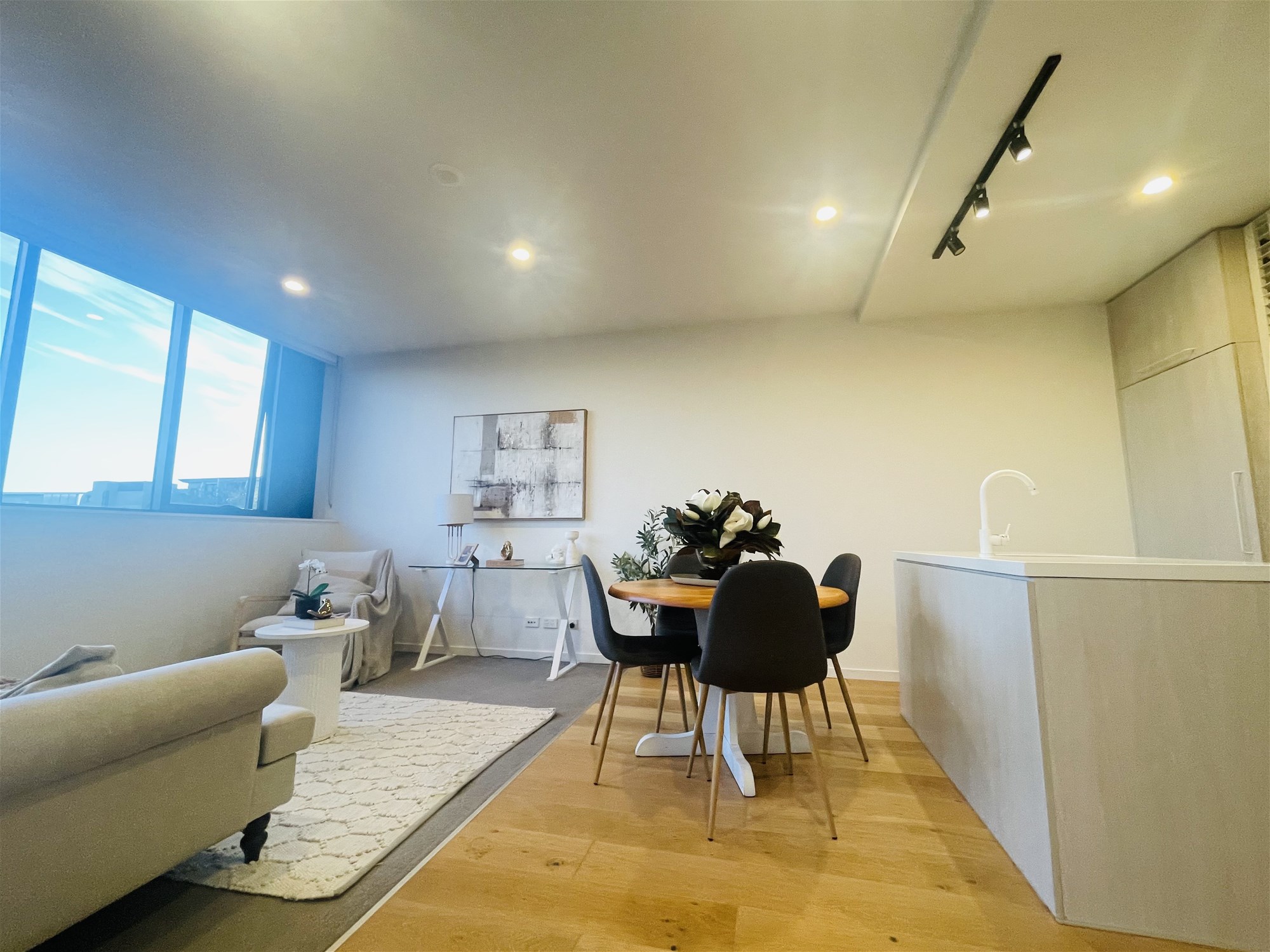 Light-filled open-plan living with timber flooring