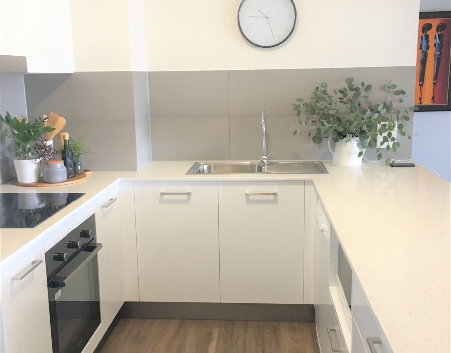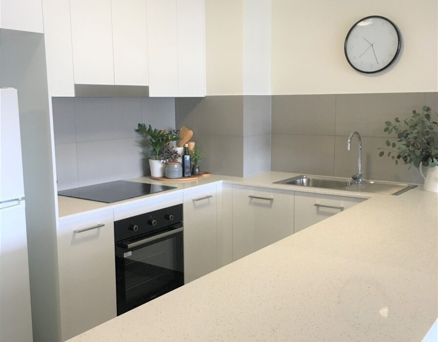 * Modern kitchen with stone bench tops, electric cooking & dishwasher