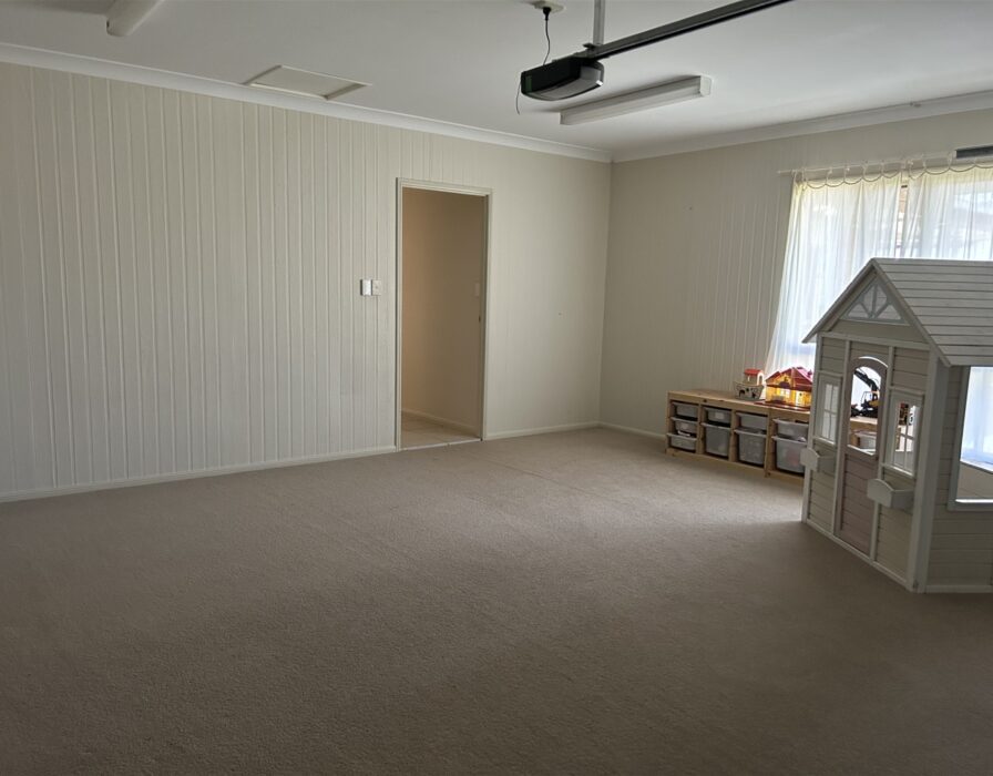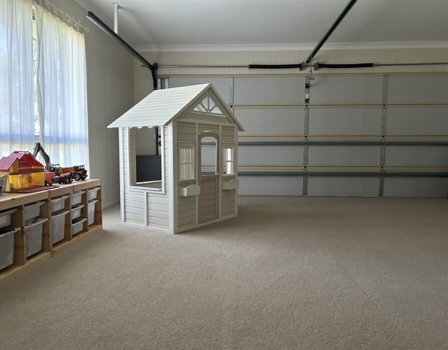 Dble remote garage is insulated & carpeted for use as a rumpus room