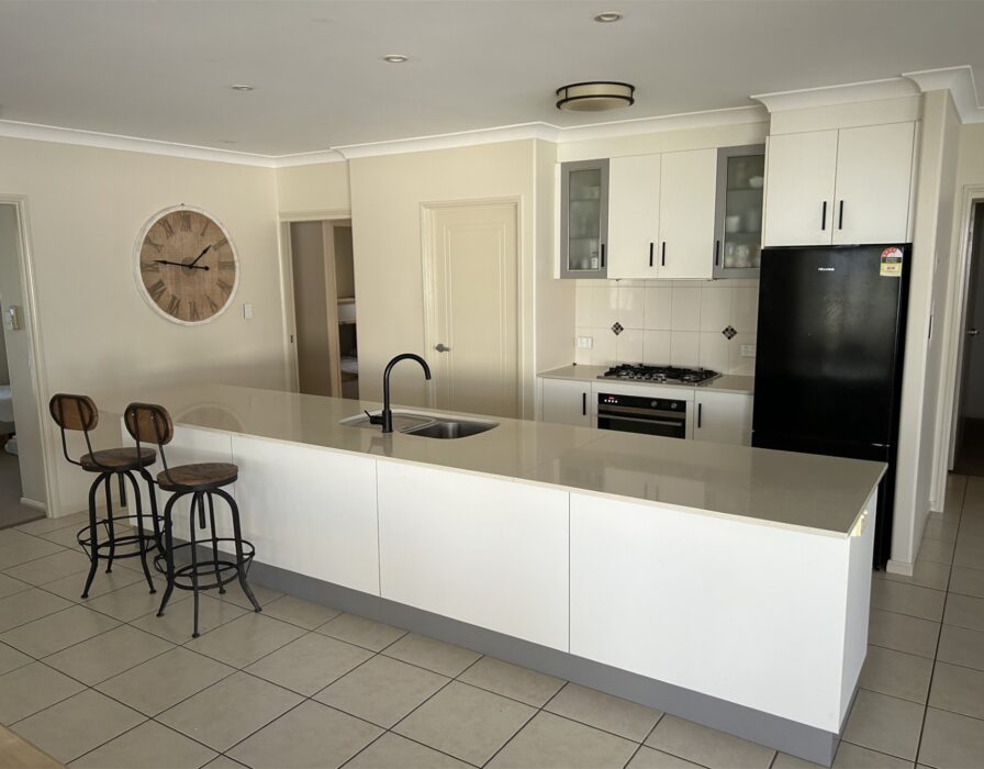Large galley kitchen with stone tops, walk in pantry, upsized oven, gas cooktop, dishwasher & long breakfast bench