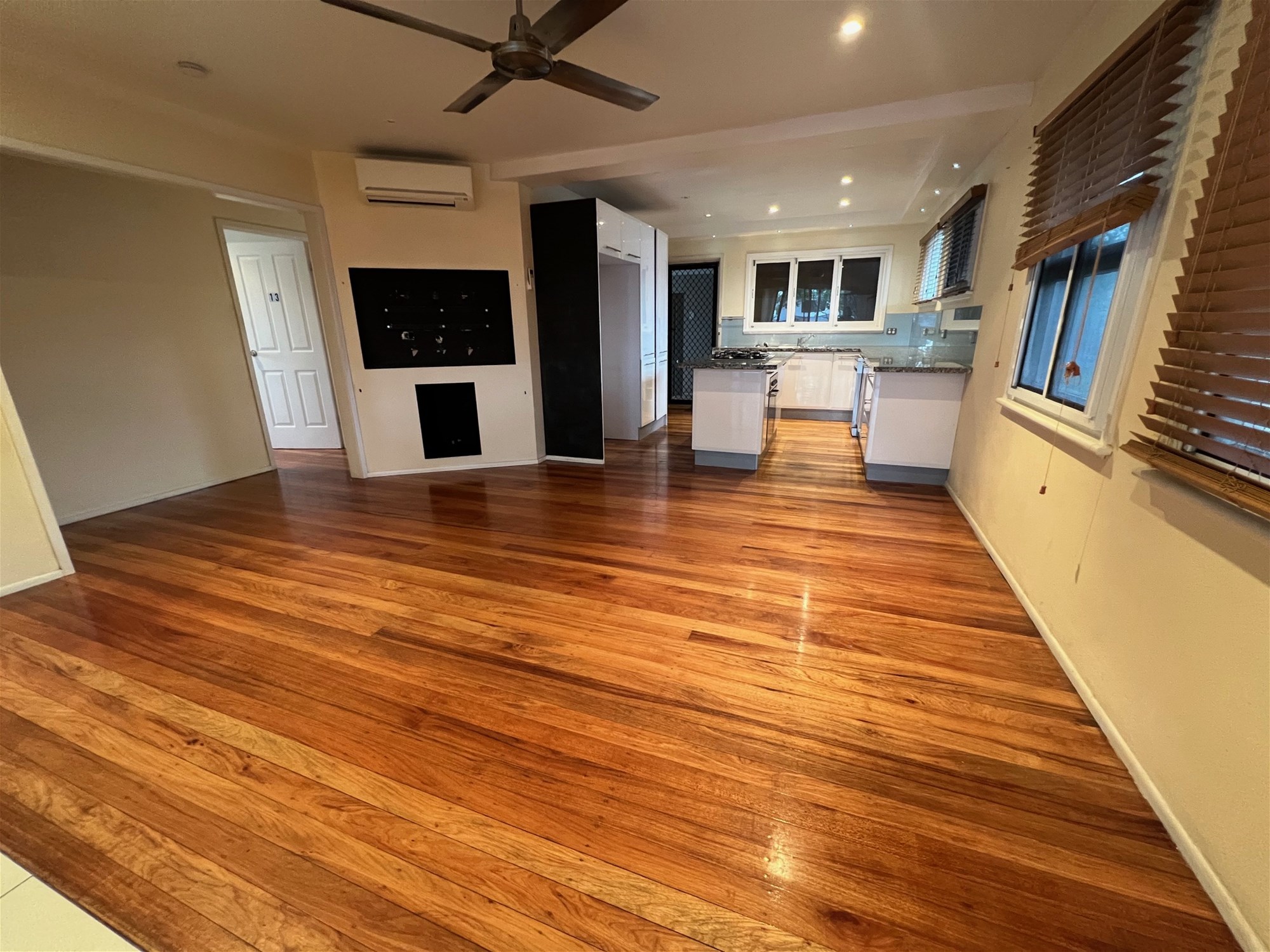Open-plan living and dining area with air conditioning and ceiling fan