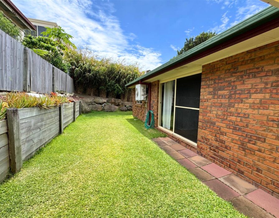 -Low-maintenance backyard with landscaped garden beds and flat lawn area
