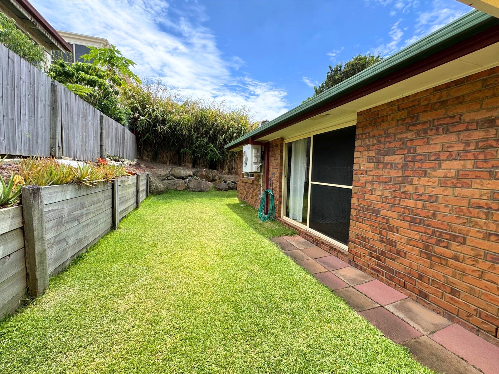 -Low-maintenance backyard with landscaped garden beds and flat lawn area