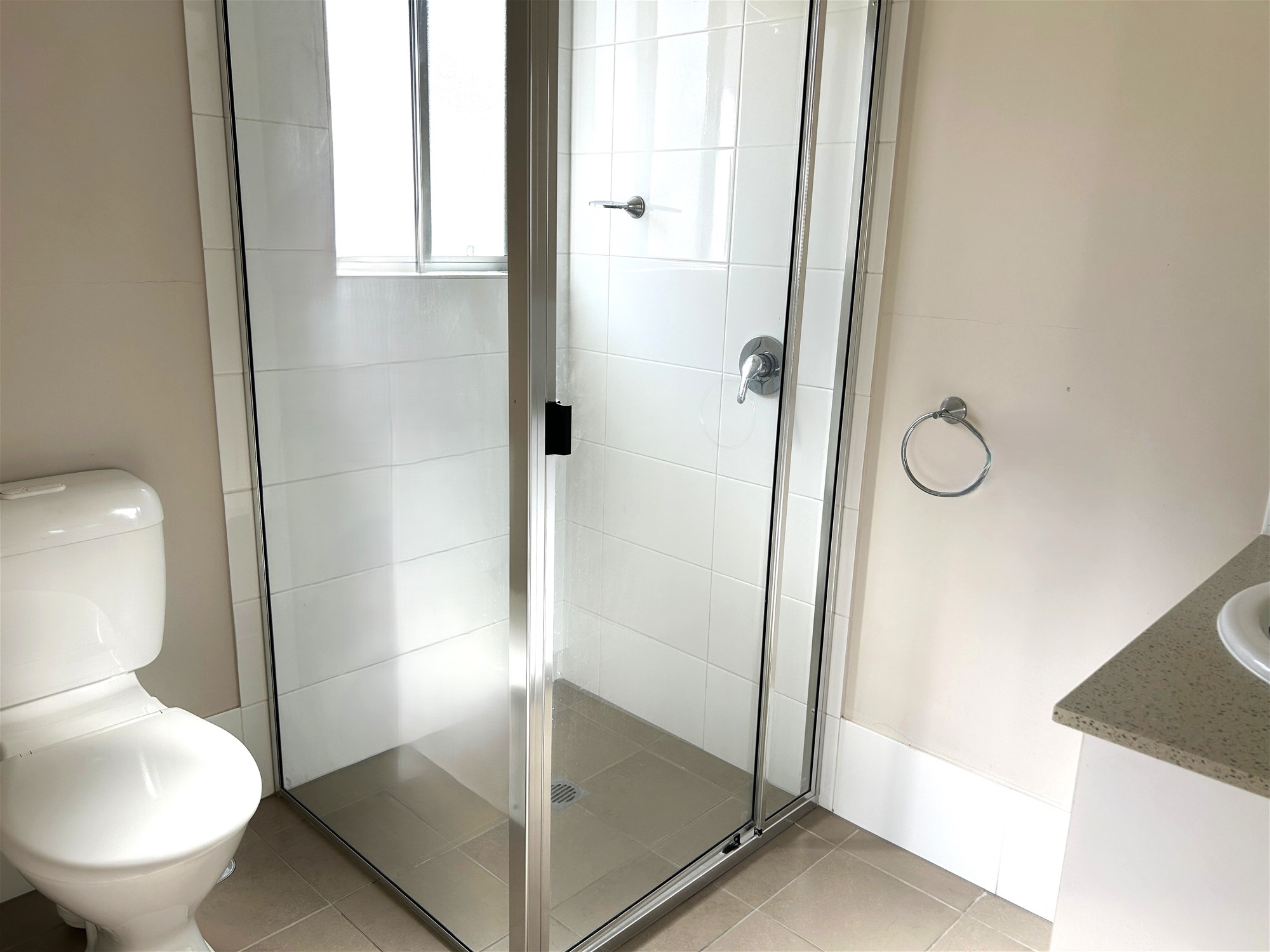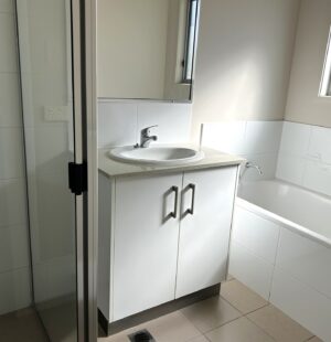 White glossy cabinetry in the kitchen and bathrooms give a fresh, modern look. The kitchen also features a dishwasher.