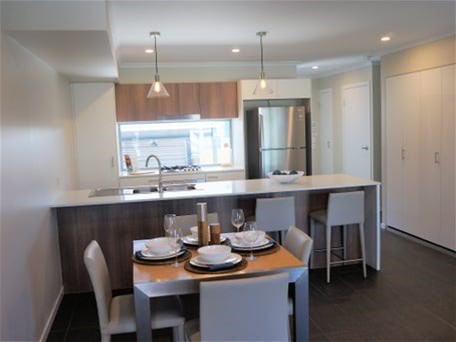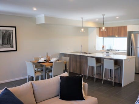 The lower level presents an open-plan layout, seamlessly connecting the kitchen, dining and living areas. The boast modern design elements, including stone benchtops, a gas stove and stainless-steel appliances. Ample cupboard storage space ensures functionality, while and expansive window positioned strategically in front of the stove floods the space with natural light.
