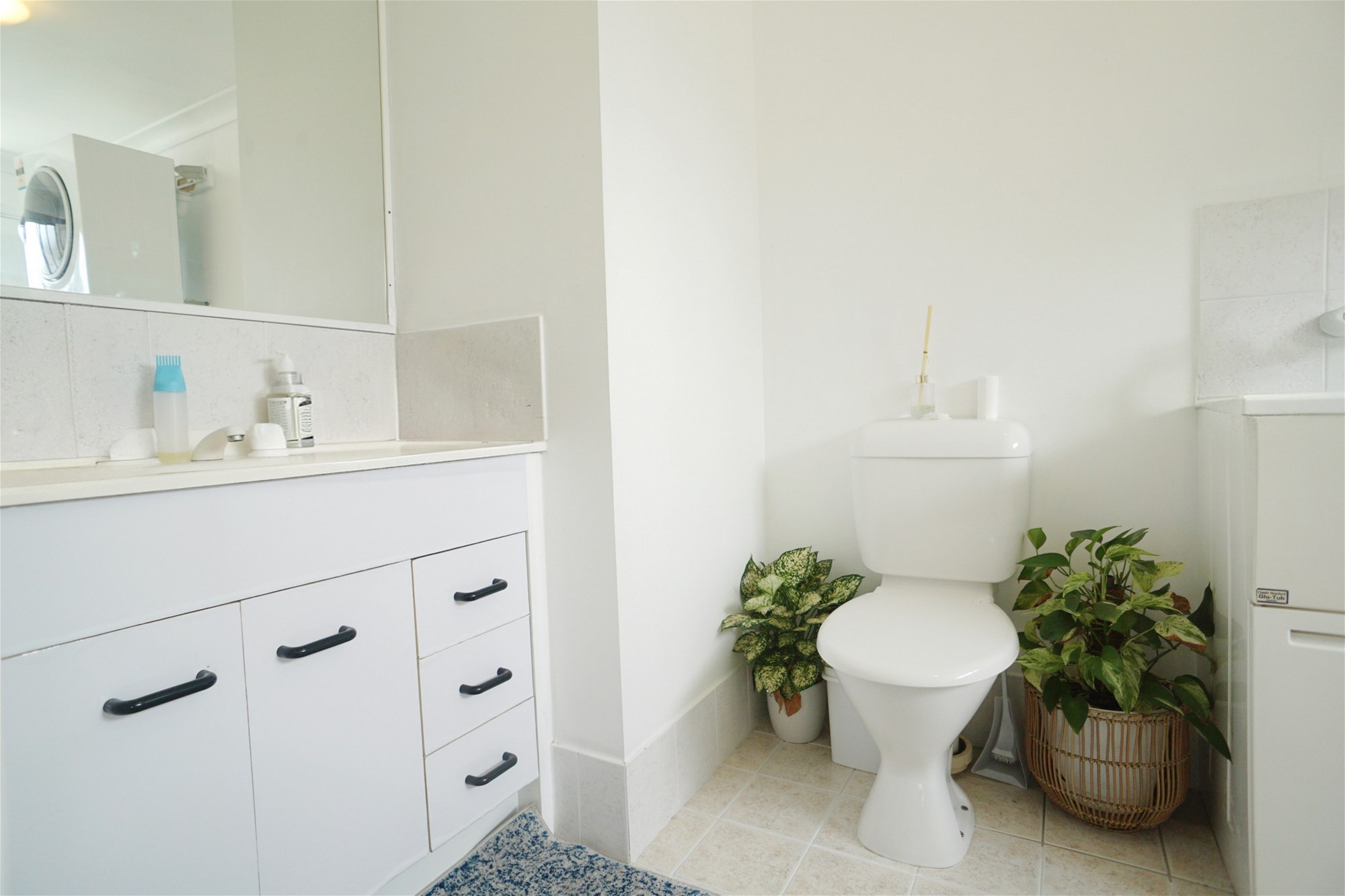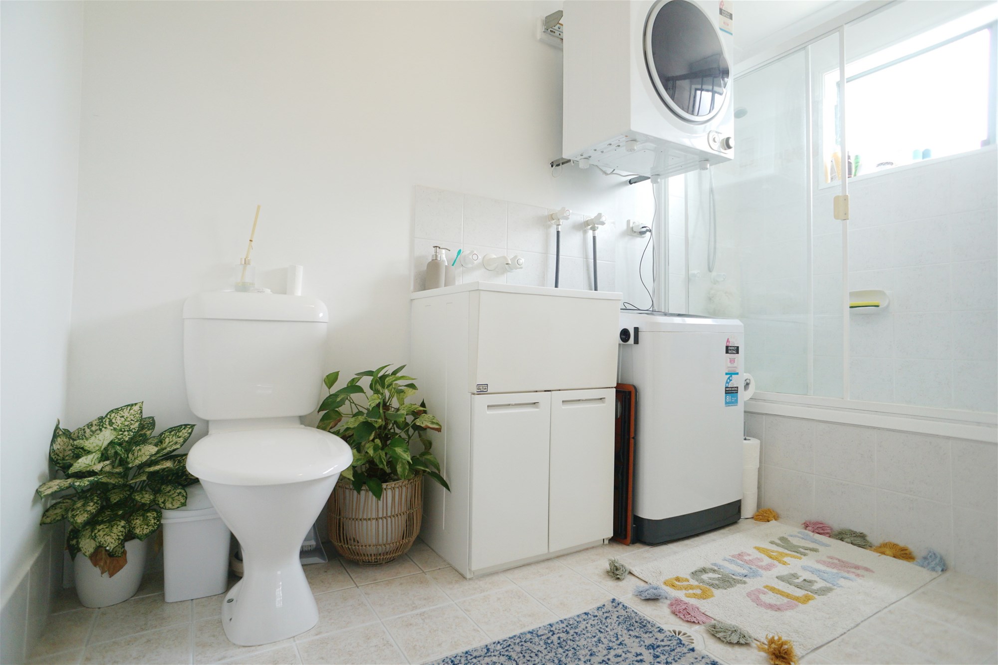 A spacious bathroom that has space for a washer and dryer.