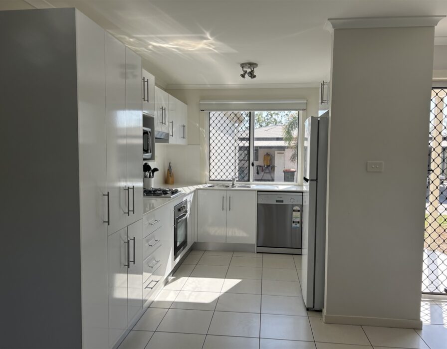 Large, fully equipped modern kitchen with gas cooktop, dishwasher, fridge and microwave