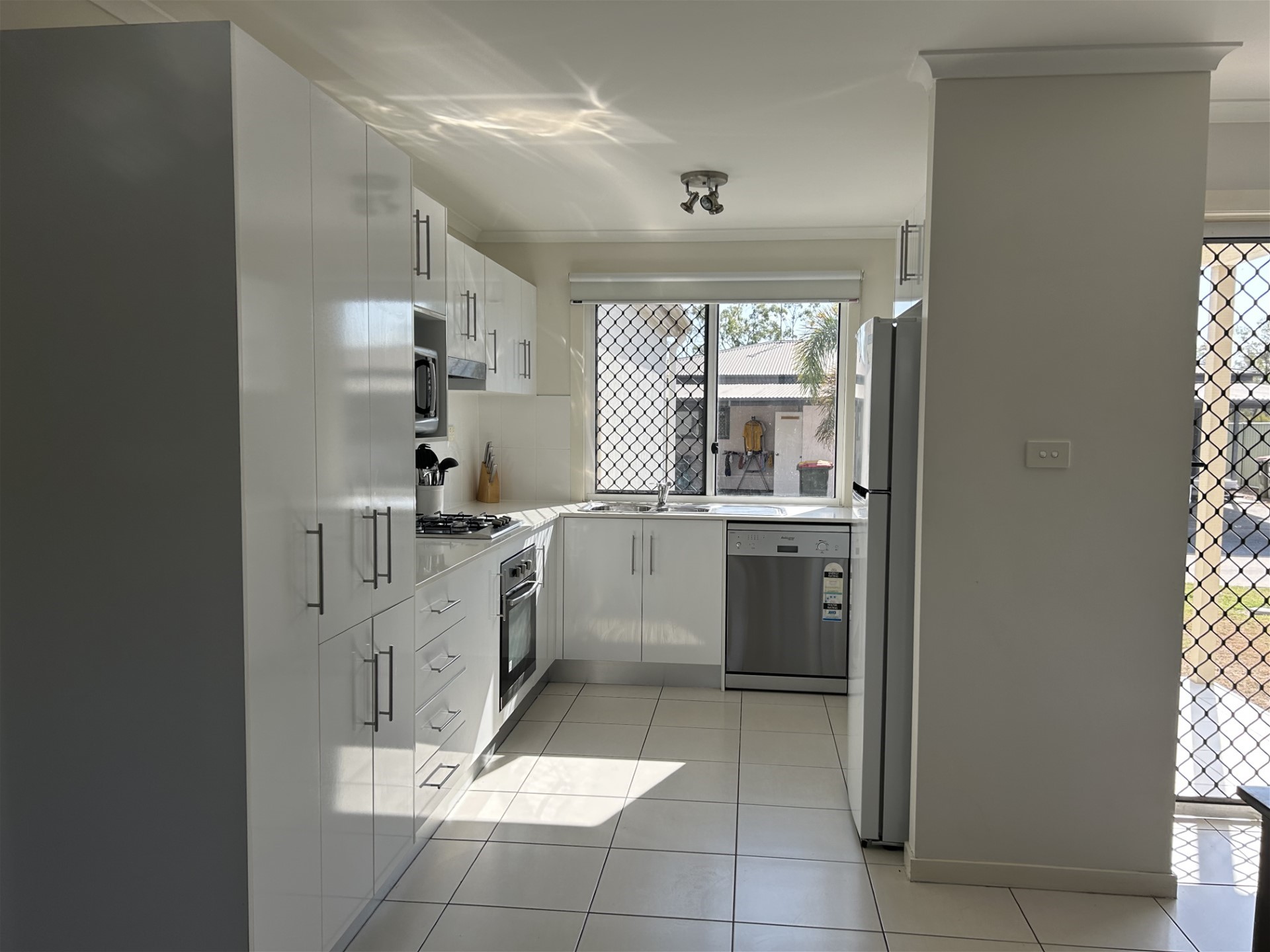 Large, fully equipped modern kitchen with gas cooktop, dishwasher, fridge and microwave