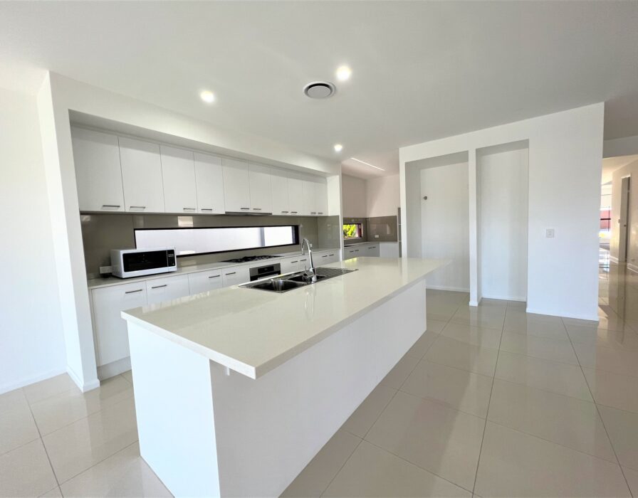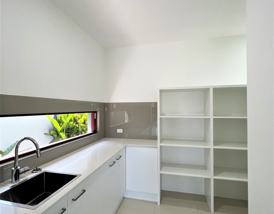 – Open-plan kitchen with stone bench top, and walk-in pantry