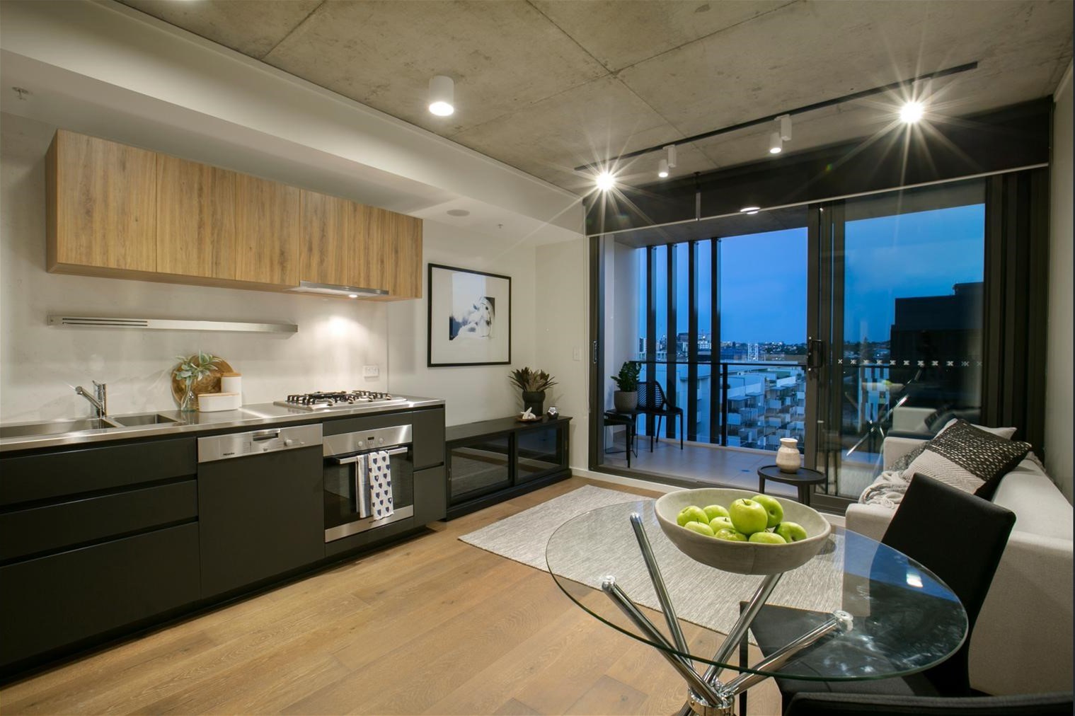 The stylishly designed kitchen comes with gas cooktop, stone & stainless bench tops and Miele appliances. The open plan living areas feature European Oak Timber floors and stunning 2.7m high concrete ceilings which is ideal for entertaining.